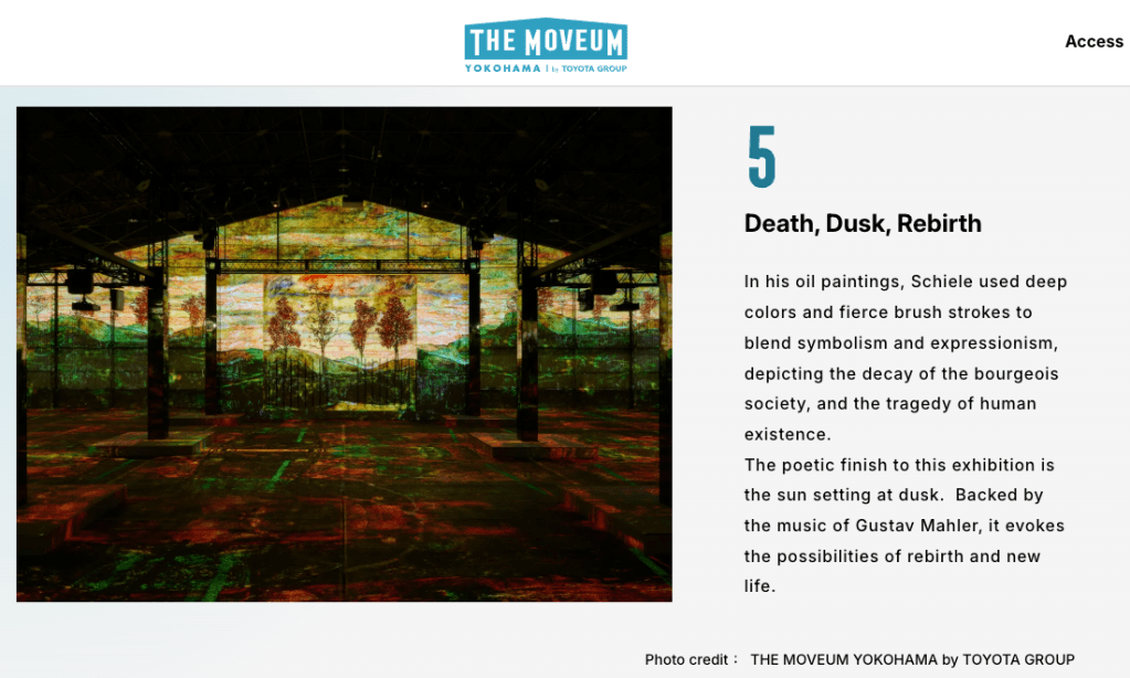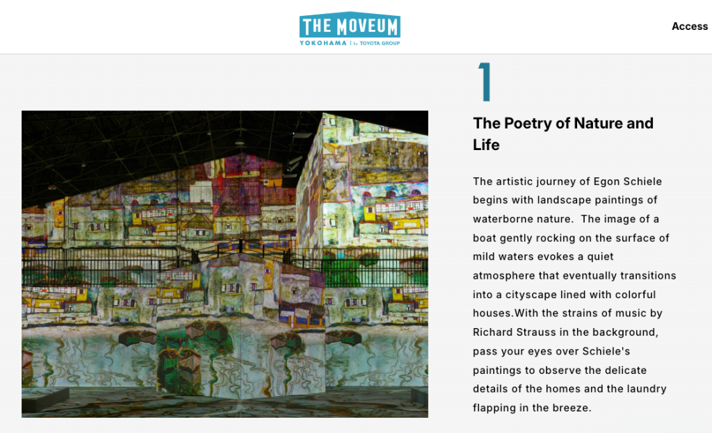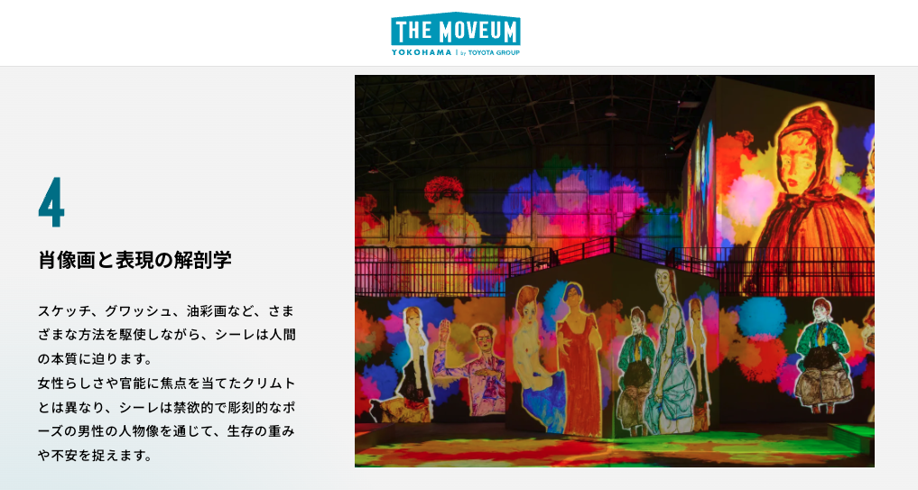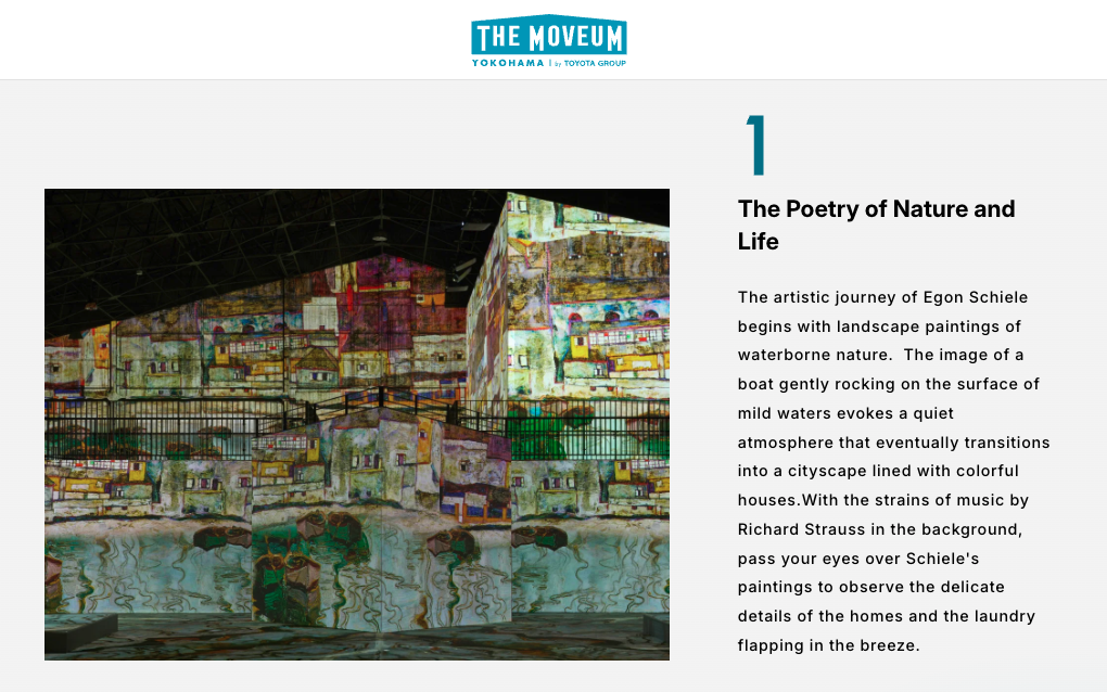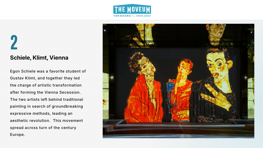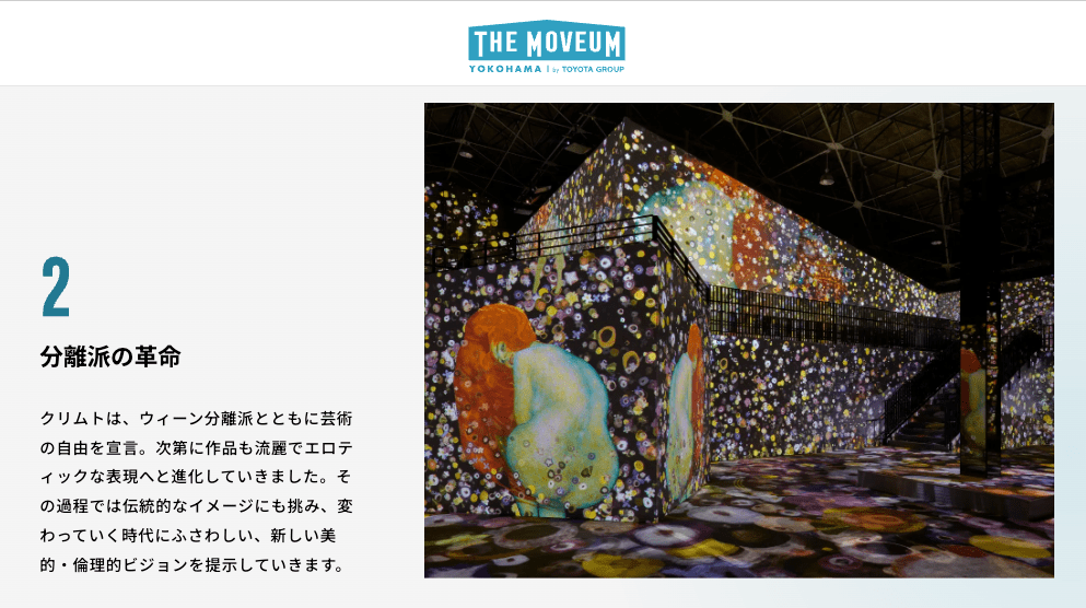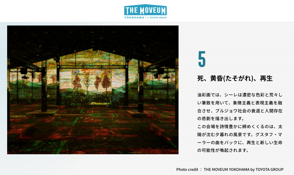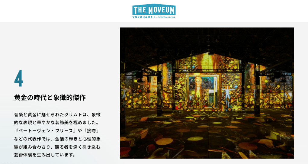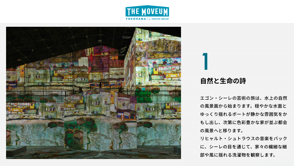 Yokohama is the port town that symbolizes Japan’s age of enlightenment. Yamashita Pier Shed No.4, a historic relic of the time, is where you’ll find THE MOVEUM YOKOHAMA. Welcome to an immersive art experience that envelops you in audiovisuals in a massive space measuring nearly 1800 ㎡.