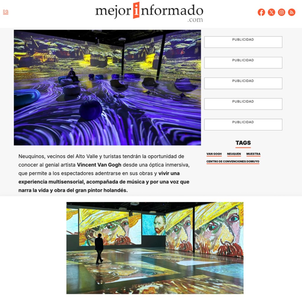 Within this framework, technology does not replace painting but amplifies its spiritual dimension. Immersion becomes an empathic process: moving color conveys the nervous tension of the brushstroke; light renders emotional instability perceptible; the sonic component structures a narrative temporality that draws the spectator closer to the artistโs inner life. The VAN GOGH IMMERSIVE ART EXPERIENCE thus configures itself as an autonomous work of digital art, capable of establishing a dialogue with the original without imitation, transforming contemplation into participation and the museum space into a sensory narrative.