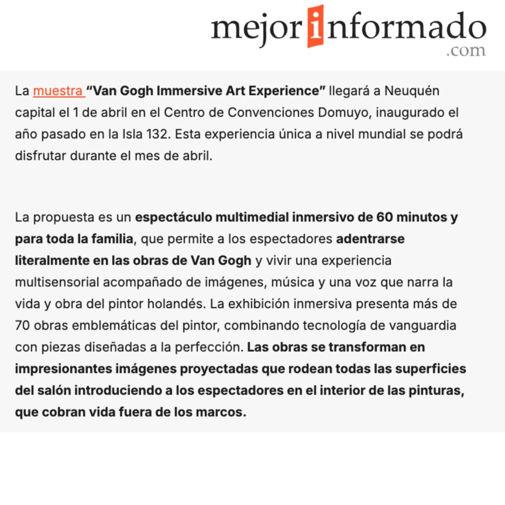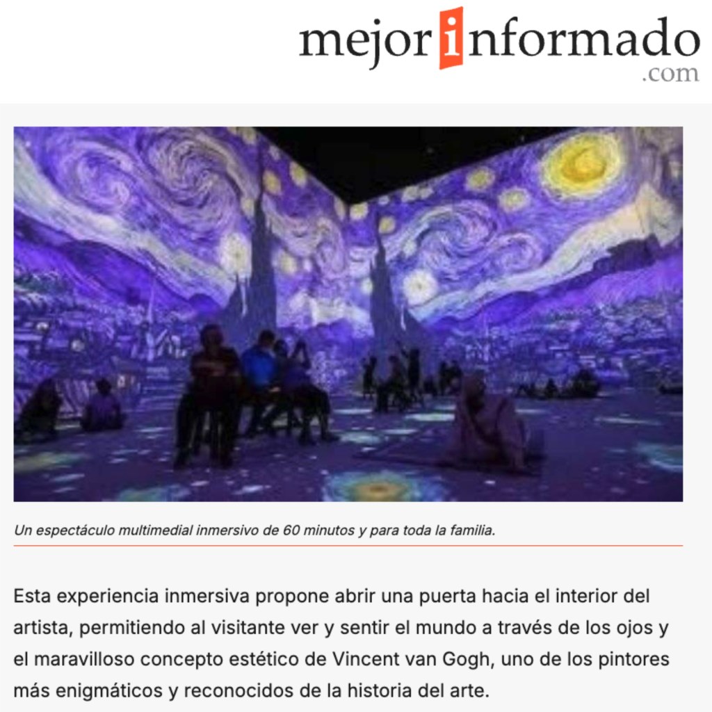 La VAN GOGH IMMERSIVE ART EXPERIENCE, creada por Stefano Fake & The Fake Factory, se sitรบa dentro del รกmbito del arte digital inmersivo como un resultado maduro de la transposiciรณn poรฉtica de la obra pictรณrica a un entorno audiovisual. El proyecto no se presenta como una simple animaciรณn de las obras de Vincent van Gogh, sino como una dramaturgia visual que reinterpreta su lenguaje a travรฉs de la luz, el movimiento y la articulaciรณn espacial.