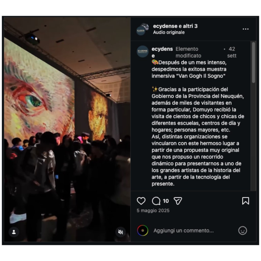 Allโinterno di questa cornice, la tecnologia non si sostituisce alla pittura, ma ne amplifica la dimensione spirituale. Lโimmersione si traduce in un processo empatico: il colore in movimento restituisce la tensione nervosa della pennellata; la luce rende percepibile lโinstabilitร emotiva; la componente sonora struttura una temporalitร narrativa che avvicina lo spettatore alla dimensione interiore dellโartista. La VAN GOGH IMMERSIVE ART EXPERIENCE si configura pertanto come opera autonoma di arte digitale, capace di instaurare un dialogo con lโoriginale senza ricorrere allโimitazione, trasformando la contemplazione in partecipazione e lo spazio museale in racconto sensibile.