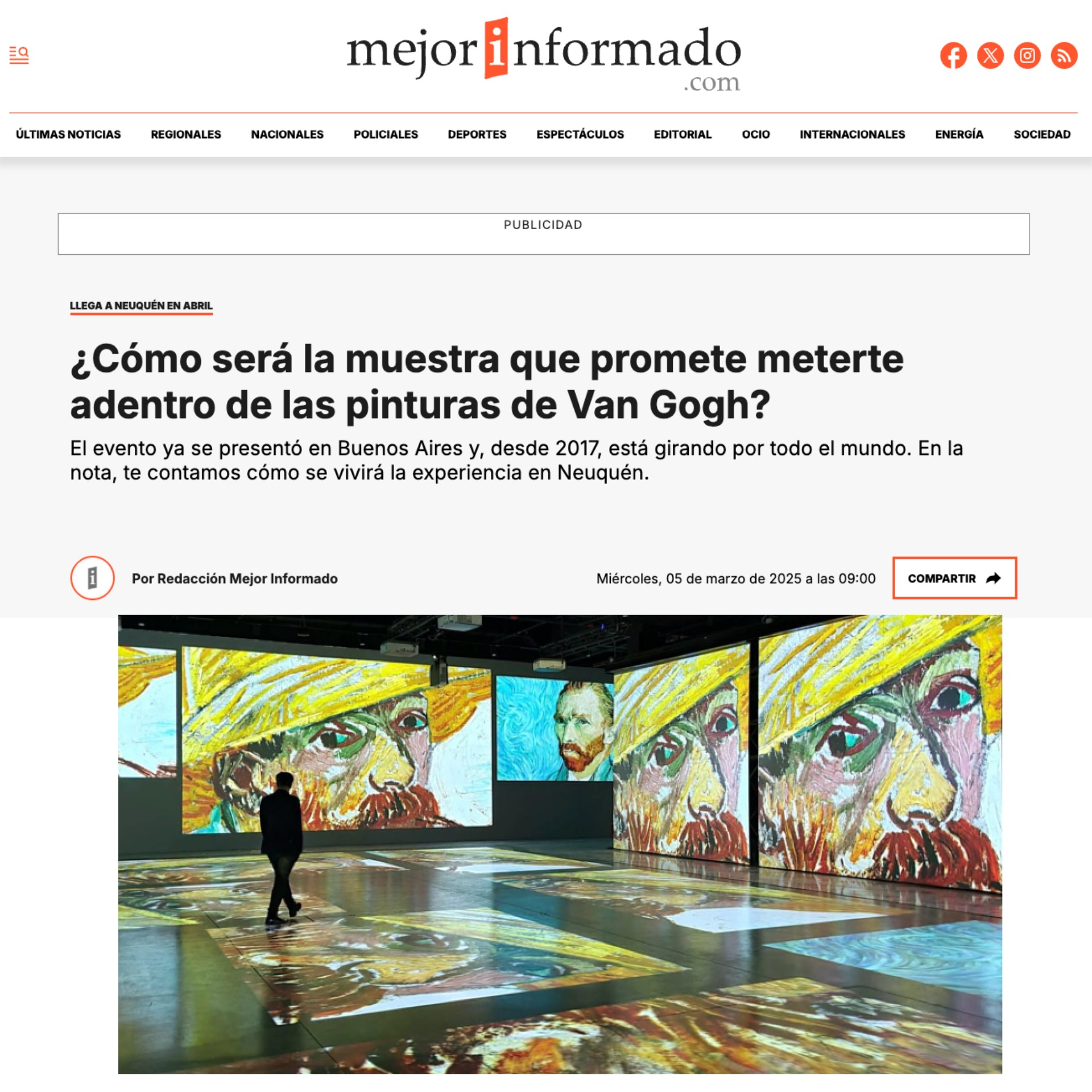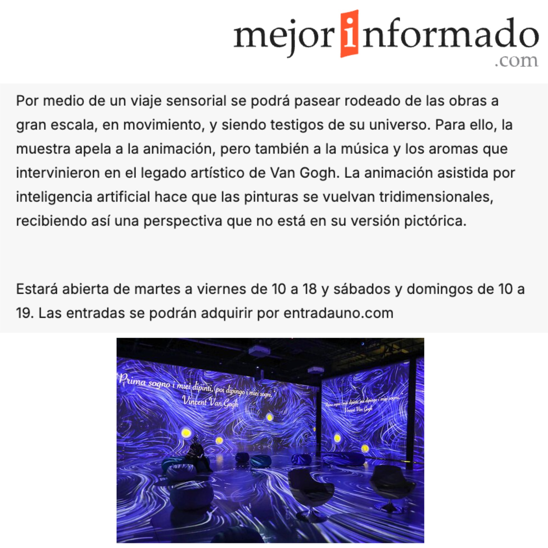 La VAN GOGH IMMERSIVE ART EXPERIENCE, creada por Stefano Fake & The Fake Factory, se sitรบa dentro del รกmbito del arte digital inmersivo como un resultado maduro de la transposiciรณn poรฉtica de la obra pictรณrica a un entorno audiovisual. El proyecto no se presenta como una simple animaciรณn de las obras de Vincent van Gogh, sino como una dramaturgia visual que reinterpreta su lenguaje a travรฉs de la luz, el movimiento y la articulaciรณn espacial.