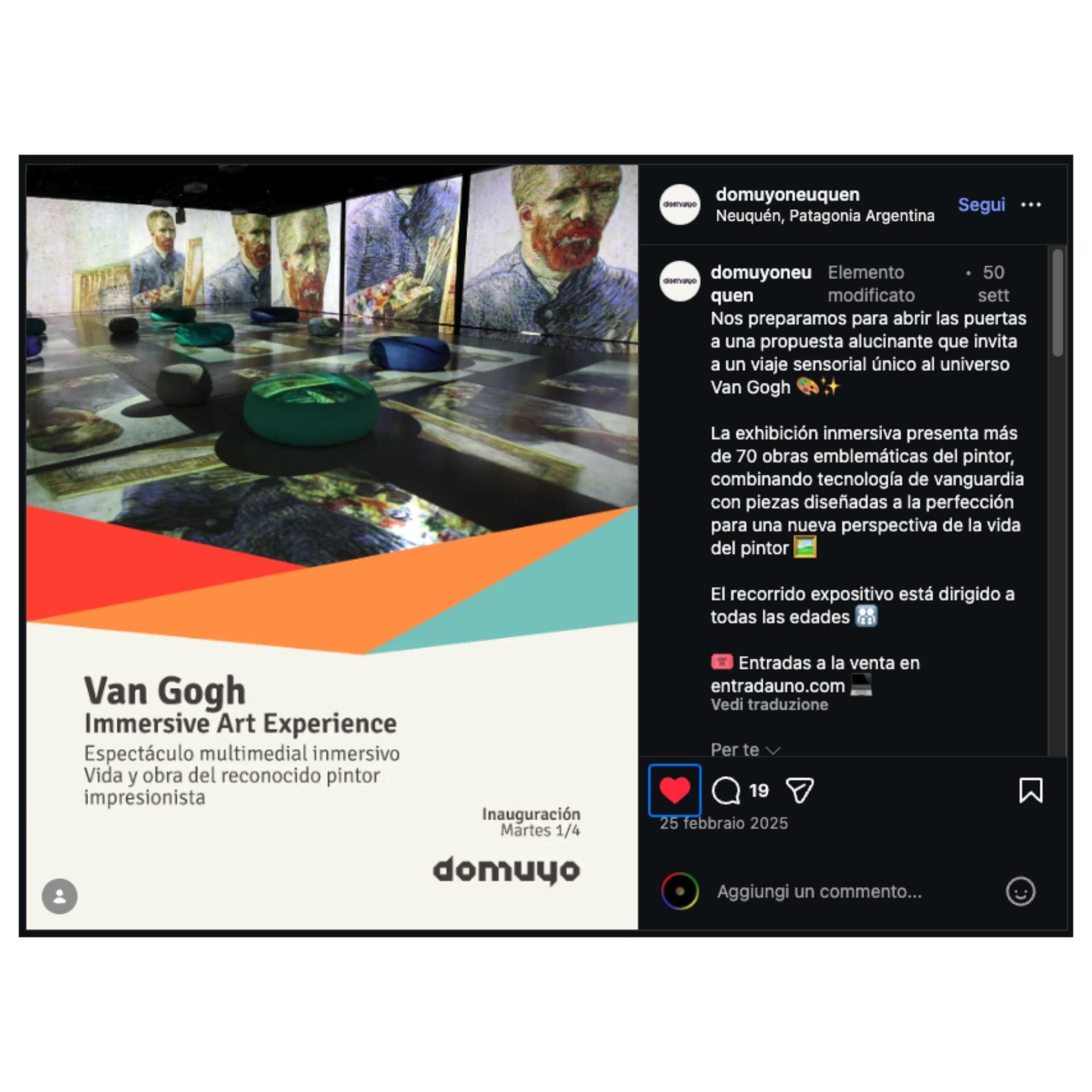 Allโinterno di questa cornice, la tecnologia non si sostituisce alla pittura, ma ne amplifica la dimensione spirituale. Lโimmersione si traduce in un processo empatico: il colore in movimento restituisce la tensione nervosa della pennellata; la luce rende percepibile lโinstabilitร emotiva; la componente sonora struttura una temporalitร narrativa che avvicina lo spettatore alla dimensione interiore dellโartista. La VAN GOGH IMMERSIVE ART EXPERIENCE si configura pertanto come opera autonoma di arte digitale, capace di instaurare un dialogo con lโoriginale senza ricorrere allโimitazione, trasformando la contemplazione in partecipazione e lo spazio museale in racconto sensibile.