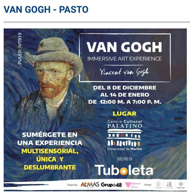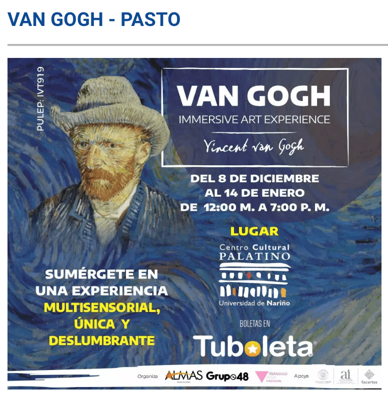 1. Galería de pinturas y biografía: Un recorrido expositivo por algunas de las obras de Van Gogh (reproducciones de los lienzos en formato largo) acompañadas de paneles explicativos.