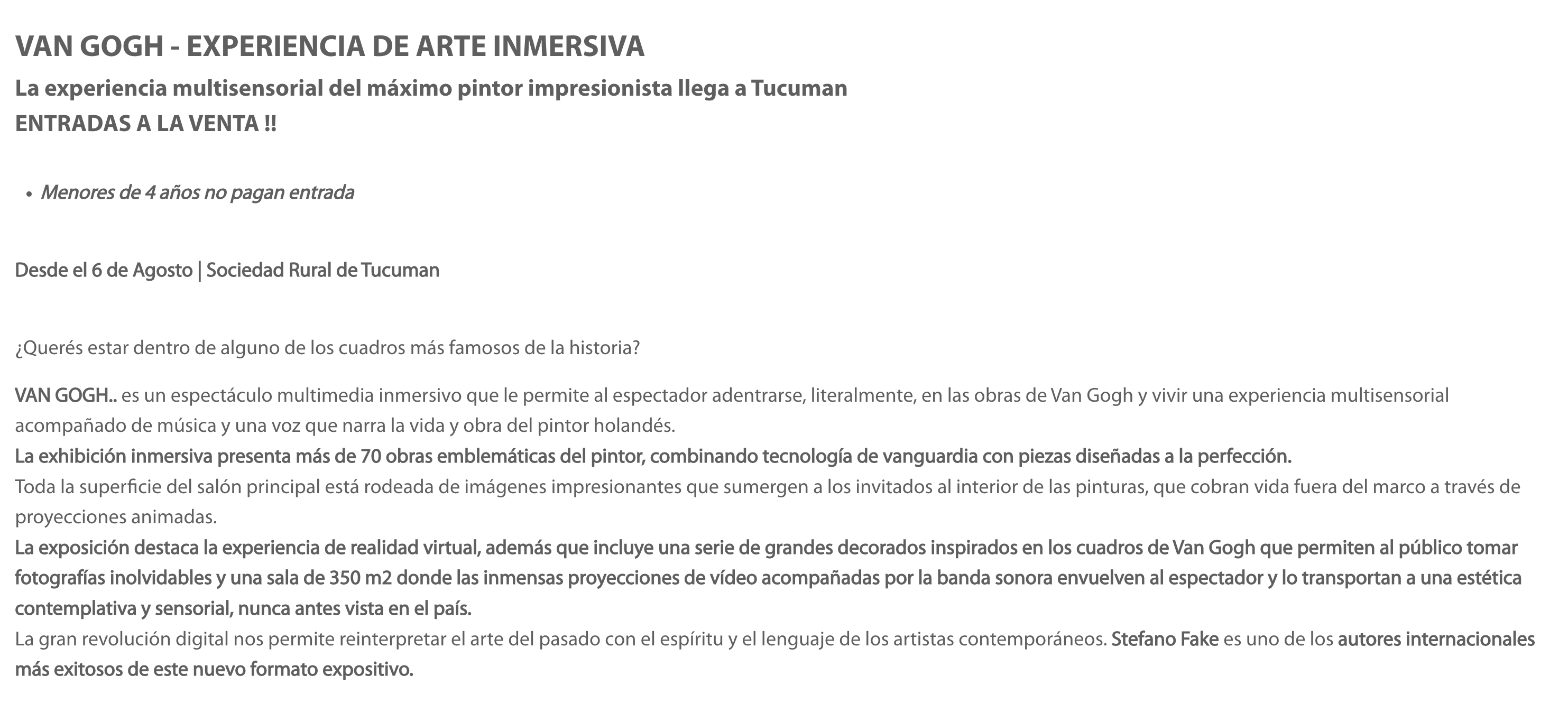 ¿Alguna vez has experimentado la sensación de sentirte dentro de un cuadro pintado por un gran maestro del pasado? Desde que el arte y la tecnología se unieron gracias a la revolución digital, una nueva forma de expresión artística ha llamado la atención del público, ganando millones de visitantes en todo el mundo, desde Francia hasta Italia, desde Estados Unidos hasta China. Los ingredientes de este éxito son probablemente las grandes proyecciones de video acompañadas de emocionantes bandas sonoras, pero esto no es suficiente para explicar el fenómeno. Como escribe Stefano Fake, uno de los principales autores internacionales de experiencias digitales inmersivas y director de esta nueva edición de VAN GOGH – IMMERSIVE ART EXPERIENCE, “no se trata simplemente de proyectar grandes imágenes que envuelvan al espectador, sino de crear un camino que estimula la mente y los sentidos del visitante y lo transporta a una nueva experiencia sensorial y estética nunca antes experimentada. El objeto de nuestra investigación como artistas digitales es precisamente el conjunto de sensaciones que experimenta el público dentro de la experiencia multimedia”.